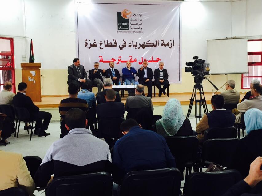 نظم الائتلاف من أجل النزاهة والمساءلة (أمان) حلقة نقاش متخصصة حول أزمة الكهرباء في قطاع غزة، في مقر الهلال الأحمر (حيدر عبد الشافي)، ضمن الجهود التي يقوم بها لتوفير ملف معلومات دقيق حول أسباب أزمة الكهرباء وآليات التغلب عليها.