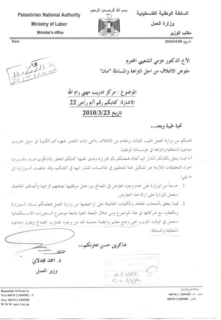 في إطار متابعة أمان لحملتها لتجنب تضارب المصالح في الوزارات الفلسطينية، وبعد ورود العديد من الشكاوى بهذا الخصوص، أعلنت وزارة العمل أنها ستعمل في الوقت القريب على وضع معايير وأنظمة جديدة تحد من وجود تضارب المصالح وتعزز مبادئ الشفافية والمساءلة في القطاع العام، فيما يتعلق بأصحاب المعاهد والكليات الحاصلة على تراخيصها من وزارة العمل. وذلك حرصا من الوزارة على عدم وجود تضارب في المصالح بين عمل موظفيها بصفتهم الشخصية وأعمالها الخاصة، وأنها ستعمل على إزالة هذا التعارض