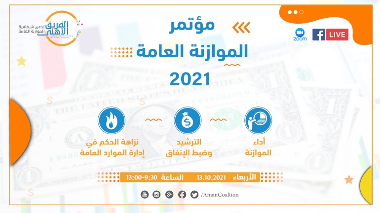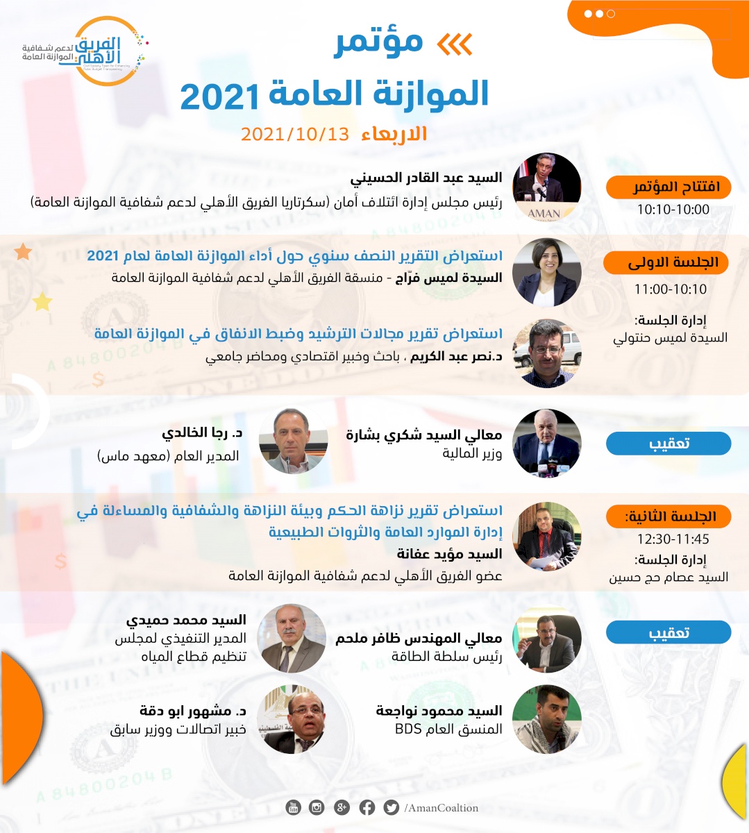 يدعوكم الفريق الاهلي لدعم شفافية الموازنة العامة للمشاركة في مؤتمره السنوي 2021. يأتي هذا المؤتمر في ظل ظروف اقتصادية صعبة وأزمات مالية متتالية سببتها قرصنة الاحتلال على الموارد المالية الفلسطينية من خلال سيطرته على أموال المقاصة، الأمر الذي كان له انعكاساته الواضحة على العجلة الاقتصادية في فلسطين. وعليه، سيركز المؤتمر في هذا العام على مجالين، الأول إعادة تسليط الضوء على مجالات الترشيد وضبط النفقات في إطار الأزمة المالية في الموازنة العامة، مستعرضين أداء الموازنة لهذا العام . أما المجال الثاني، فسيركز على نزاهة الحكم في إدارة الموارد العامة والثروات الطبيعية، للخروج بالتوصيات اللازمة لضبط الإنفاق والحدّ من الاقتراض، وتعزيز نزاهة الحكم في إدارة الموارد العامة.
