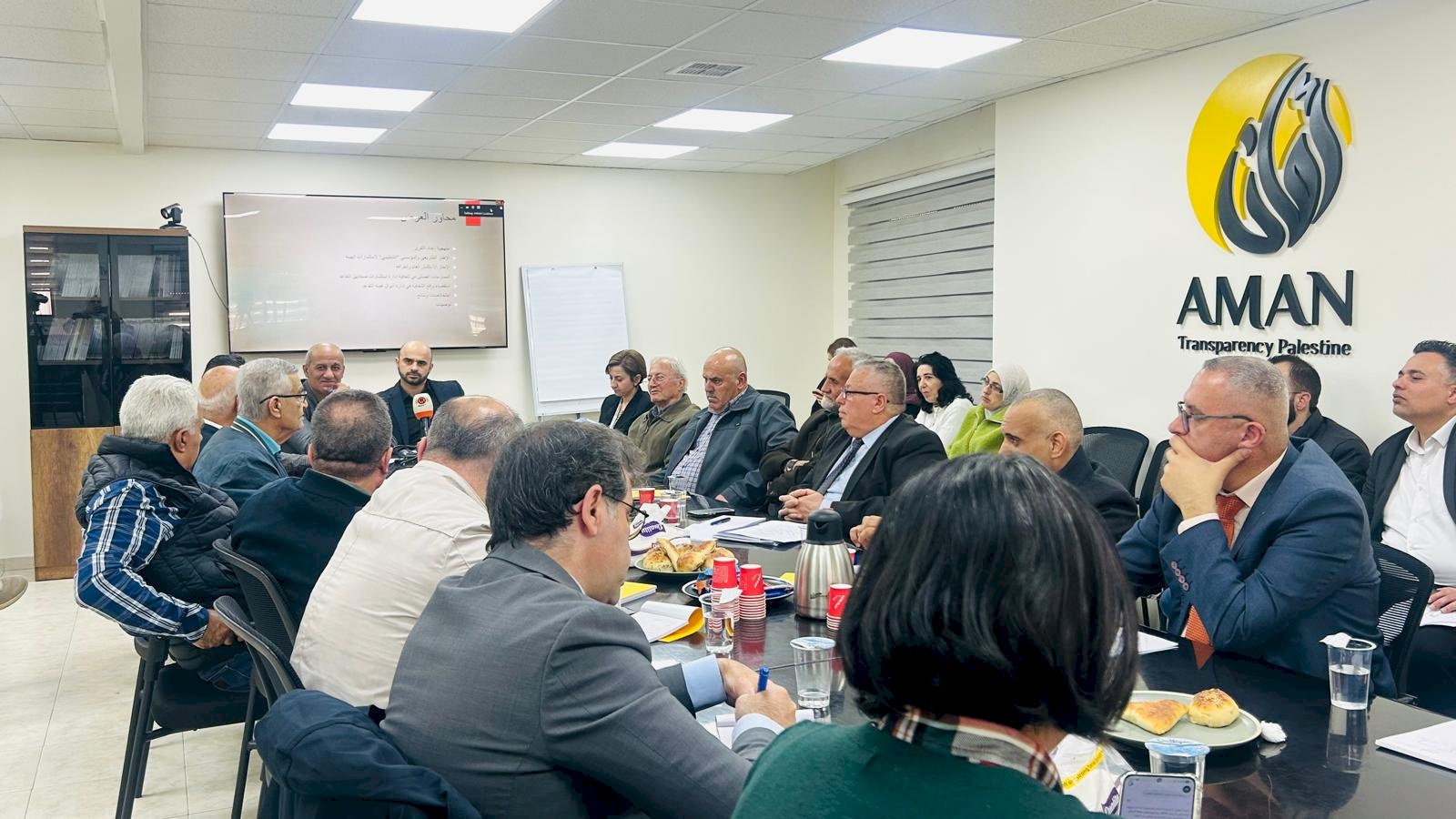Ramallah – The Coalition for Integrity and Accountability (AMAN) held a discussion session to present the draft of its new report on transparency in managing the investment of the Palestinian Pension Agency’s funds. The participants were representatives from the Council of Ministers, various ministries, official institutions, the Palestine Monetary Authority, civil society, the media, and the Retirees’ Association. AMAN also invited the Palestinian Pension Agency and its Board of Directors, but they did not attend.