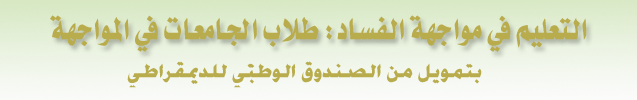 قام الصندوق الوطني للديمقراطية بتبني المشروع وتمويله لمدة اثني عشر شهرا بعنوان : "التعليم في مواجهة الفساد : طلاب الجامعات في المواجهة." الهدف الرئيسي من المشروع هو تزويد الشباب الفلسطيني بمفهوم الحكم الصالح، الشفافية والمساءلة والنزاهة كوسائل لخلق مجتمع مكافح للفساد بين الأجيال الشابة.